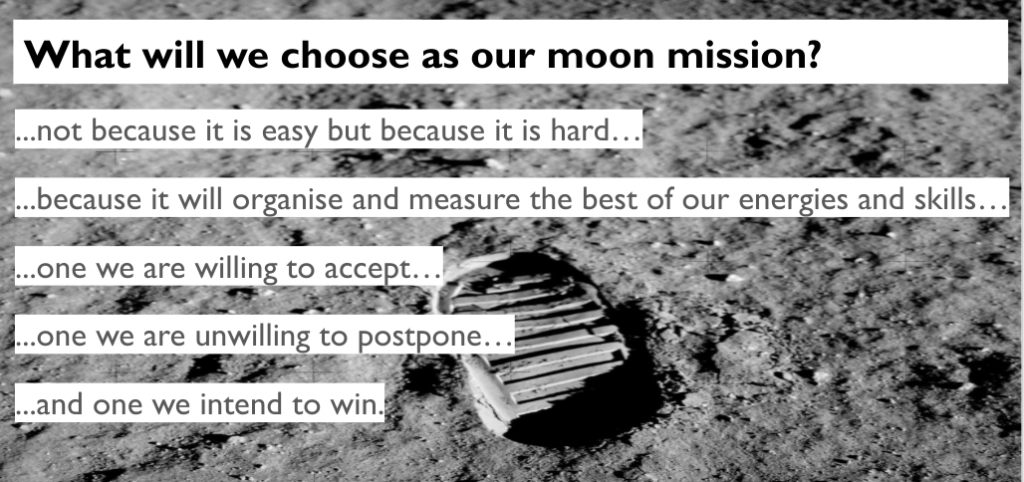 We had scheduled to launch the project on a Thursday afternoon before training. It just so happened this was on the 12th of September (note the date of JFK’s speech in 1962 – 57 years to the day) where we showed the group this video and asked them to think and dream big: