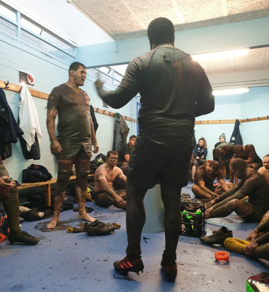During the game, Belly had smashed his nose (Above: 4th from left, front row) and was replaced. Larry (Below: Back to Camera), as vice-captain, steered the team to a bonus point victory in miserable conditions. Charlie (Below: Left) was a Trojan who lead the charge in terms of work-rate. Whenever I see the image below I always think of the word ‘Empty‘ because of how much the group had invested in that victory.